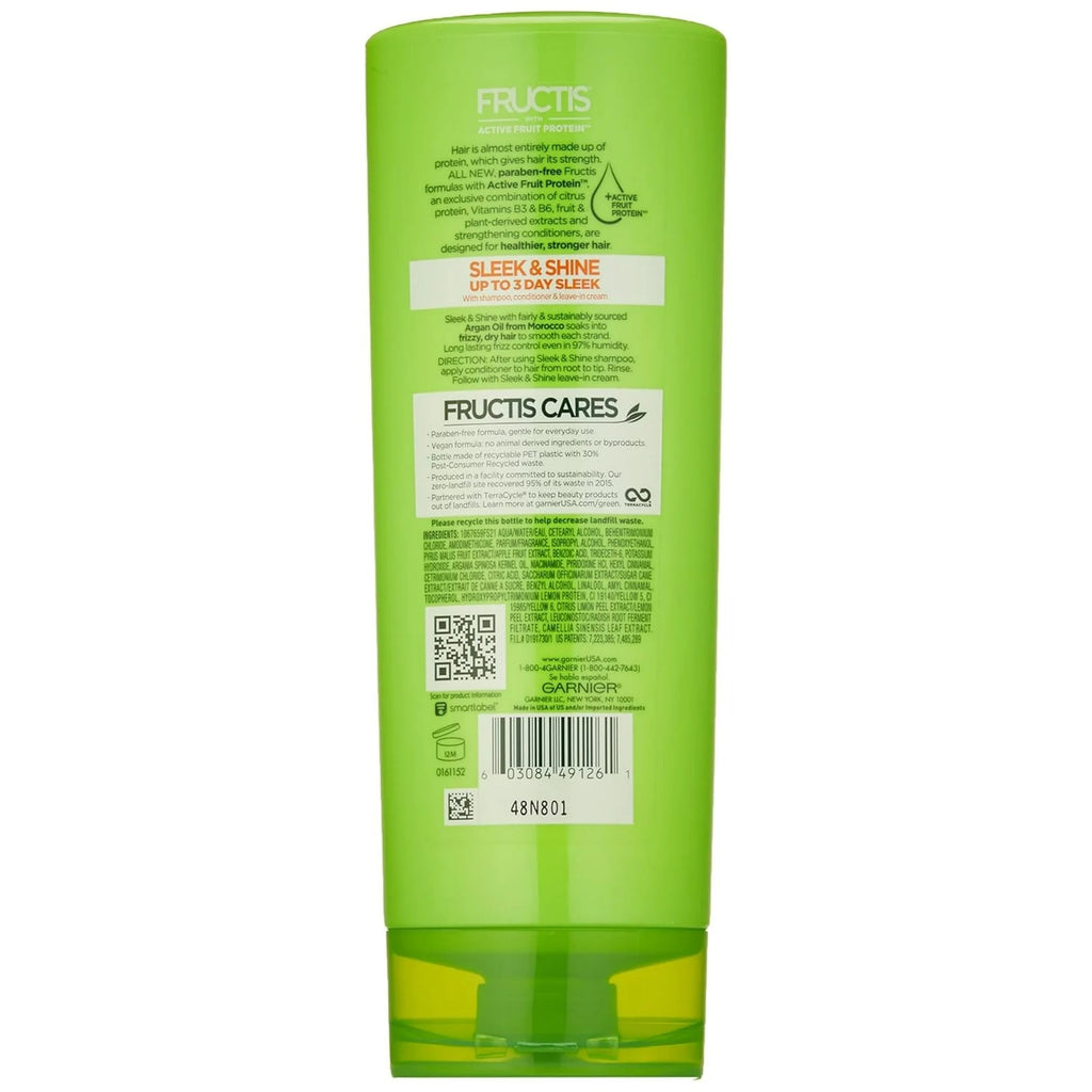 - Garnier Fructis Sleek and Shine Shampoo with fairly and sustainably sourced Argan Oil from Morocco soaks into frizzy, dry hair to smooth each strand; Long lasting frizz control even in 97 percent humidity
