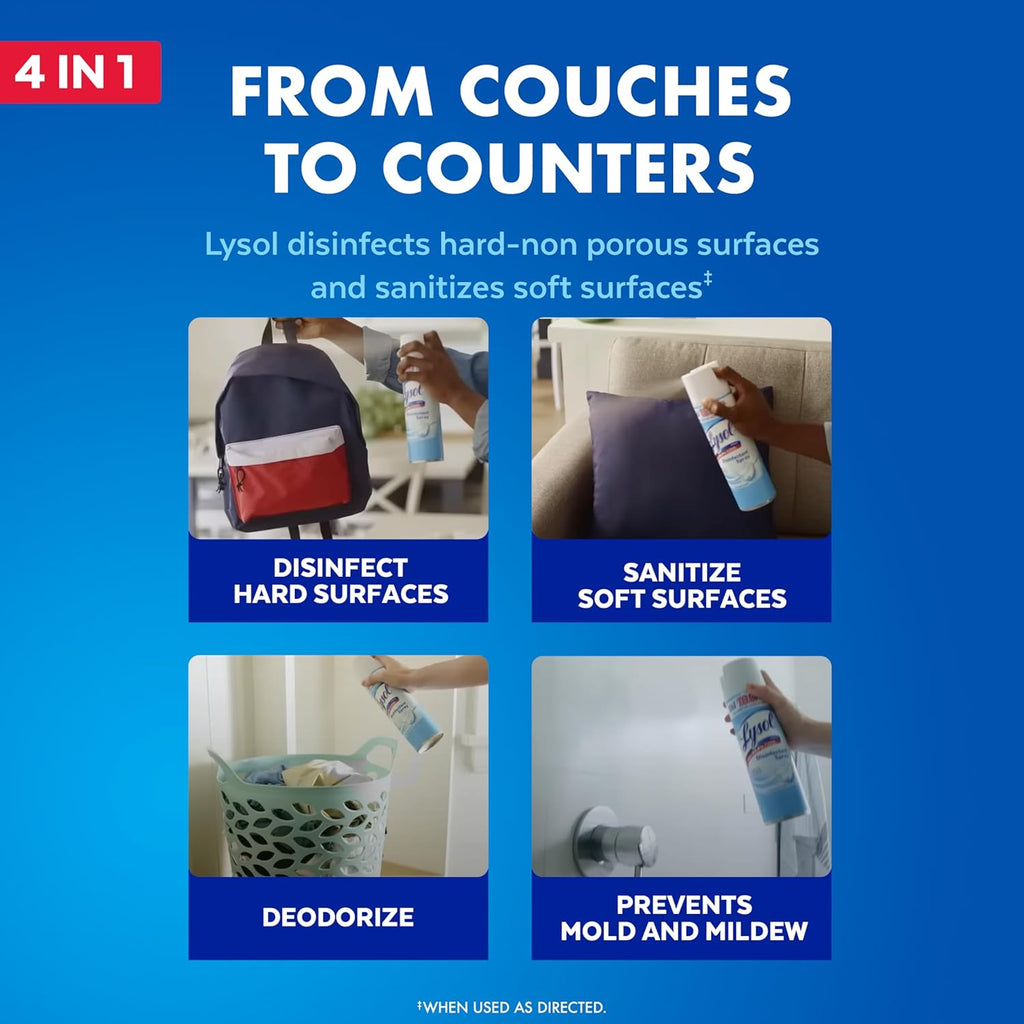 Keep your home safe, fresh, and germ-free with Lysol Disinfectant Spray. This trusted household essential kills 99.9% of viruses and bacteria, including cold and flu viruses, Norovirus and even the COVID-19 virus. Perfect for every room, it sanitizes, disinfects and deodorizes hard and soft surfaces with a crisp linen scent.