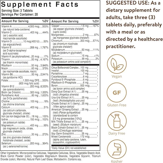 Female Multiple Tablets is one of Solgar’s premium-quality women’s health products.* Advanced phytonutrient multiple vitamin, mineral and herbal formula for women.