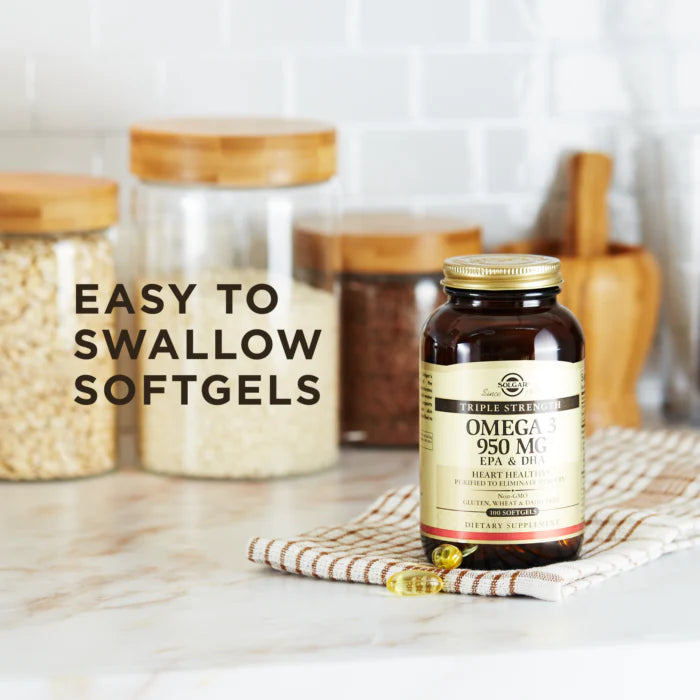Solgar Triple Strength Omega-3 950 mg delivers a concentrated source of high-quality fish oil, providing naturally occurring omega-3 fatty acids — EPA and DHA — in every softgel.