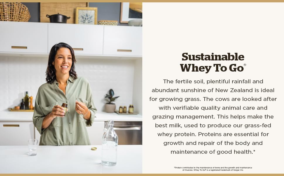 - DAILY PROTEIN; Solgar Whey To Go protein powder is formulated with grass-fed whey from pasture-raised New Zealand cows. One scoop provides 20 grams of whey protein – perfect for anyone looking to support their daily protein intake